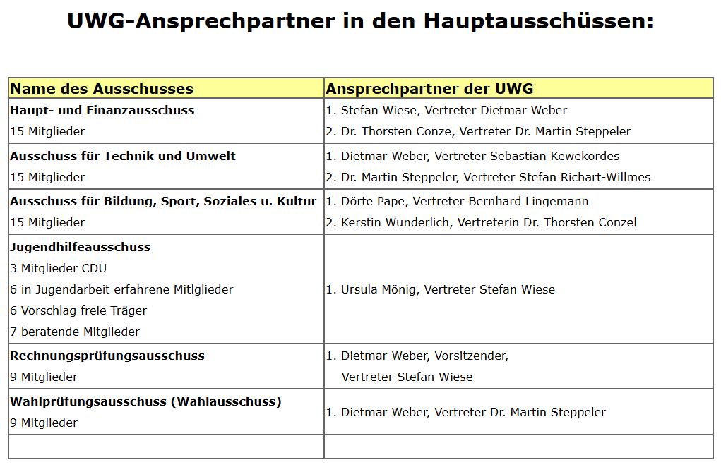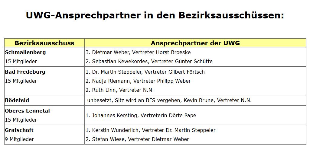 Leider hat die CDU in fast allen Ausschüssen die Mehrheit. Die Kommunalwahl 2025 hat diese Situation noch verstärkt.Mehrheit. Nur im Bezirksausschuss Bad Fredeburg wird die UWG zusammen mit den anderen Parteien eine Mehrheit haben.